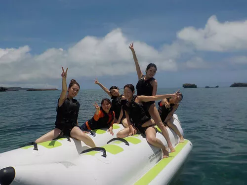 バナナボート、スーパーブッバ、ウェイクボード、フライボード、ホバーボード、SUP、カヤック、ビックボーイ、スリラー、マリンジェット、バナナボートで行く無人島クルーズ、バナナでボート浜比嘉島