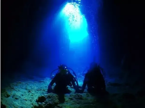沖縄 青の洞窟は、神秘の光です。 ダイビングでしか見れない、写真では説明できない青色。とてもきれいな青色を見て頂けます。朝、昼、夕刻全ての時間、青の洞窟は常にきれいです。