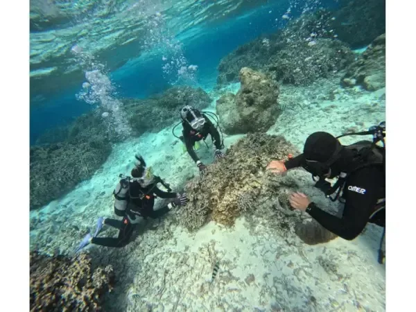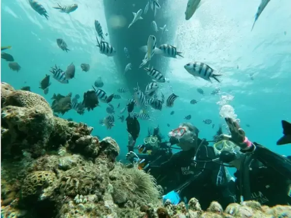 ダイビング器材をボートの上で装着します。 ボートから、ゆっくり海に入ります。水深の浅い場所で呼吸の練習、耳抜きの練習をします。マスター出来たら、体験ダイビングスタートです。