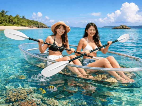 透明のカヤックに乗って恩納村の海を遊ぶことができます!