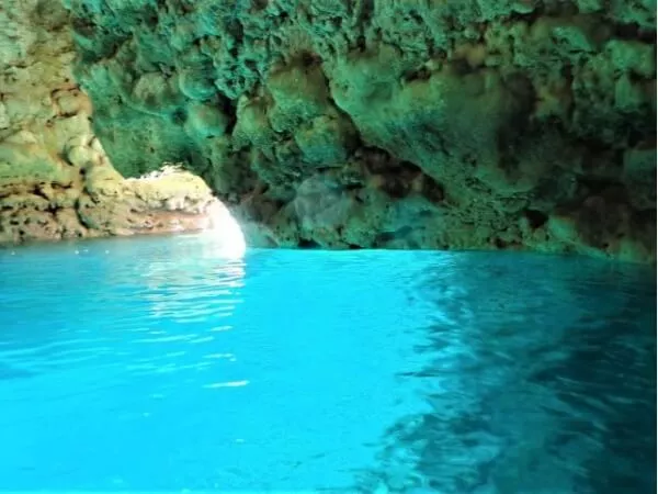 青の洞窟の奥を進み振り返ると 神秘的な光景が広がっています。