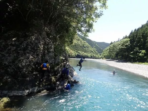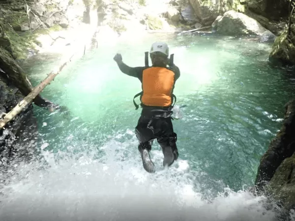 大きな淵を有する渓谷を飛び込んだり滑ったりダイナミックに遊びます。