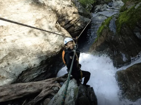 どきどきコースはガイド操作によるハーネスを使ったロープ下降が含まれ、本格的なキャニオニングが楽しめます。