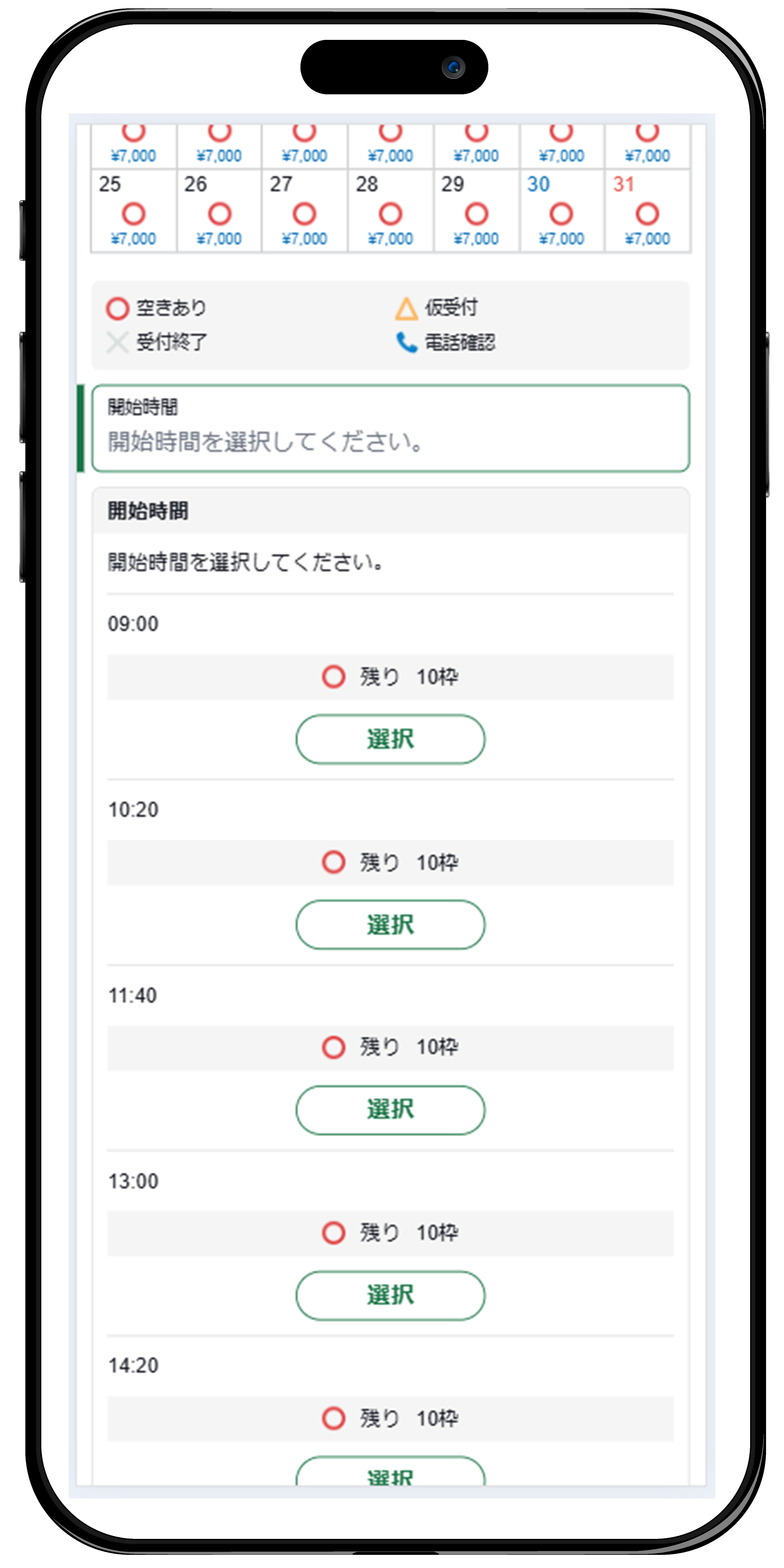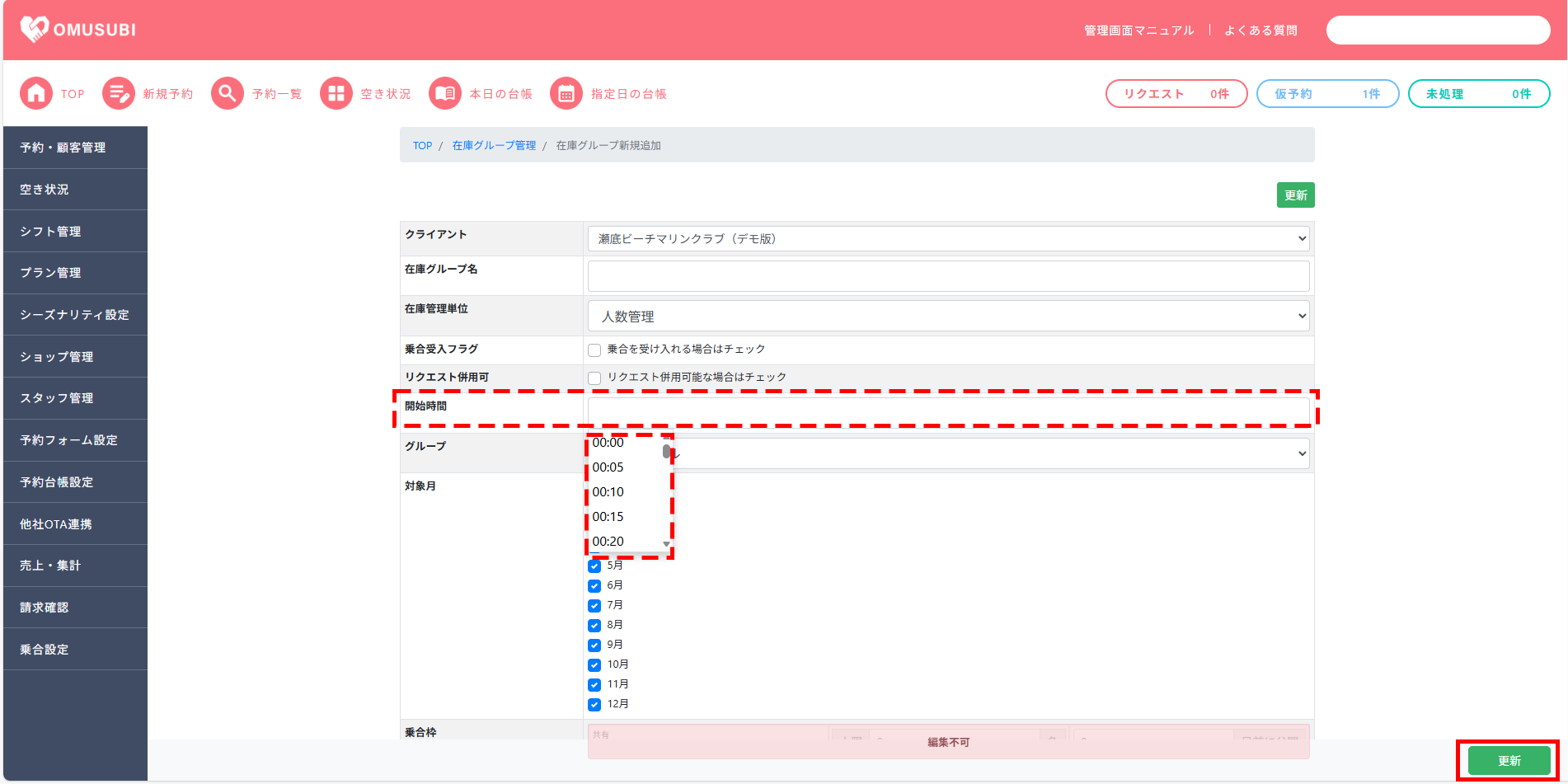 開始時間の設定方法です。設定いただいた時間がプラン詳細内の[説明文][予約カレンダー]へ表示されます。