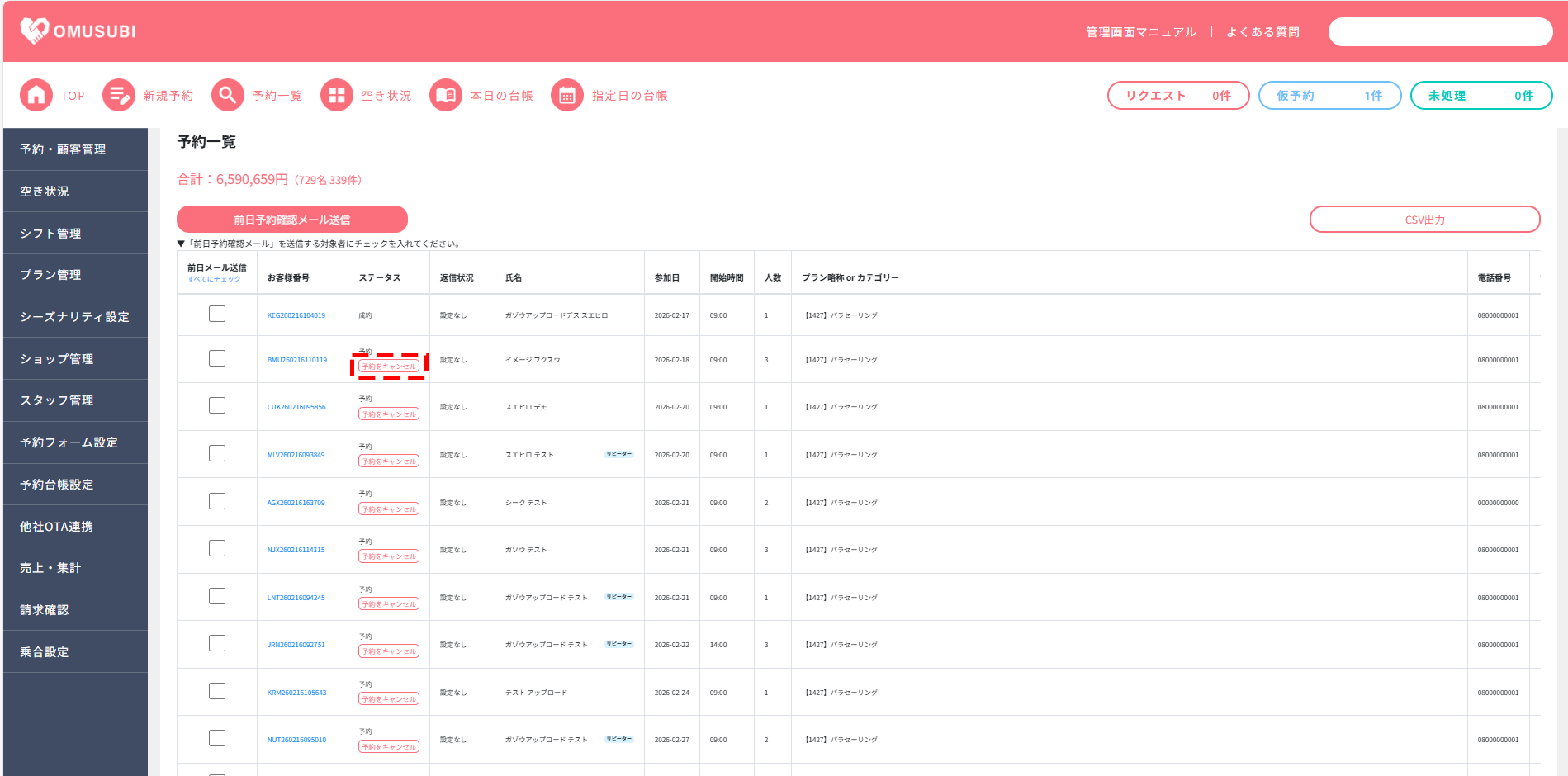 予約一覧画面にて、お客様のご予約情報を一覧で表示します。