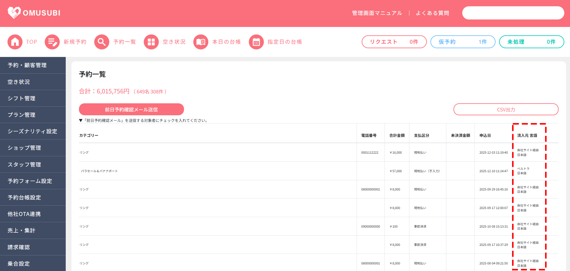 貴社Webページに設置いただきました予約フォーム経由のご予約情報は、OMUSUBI管理画面へ蓄積されます。