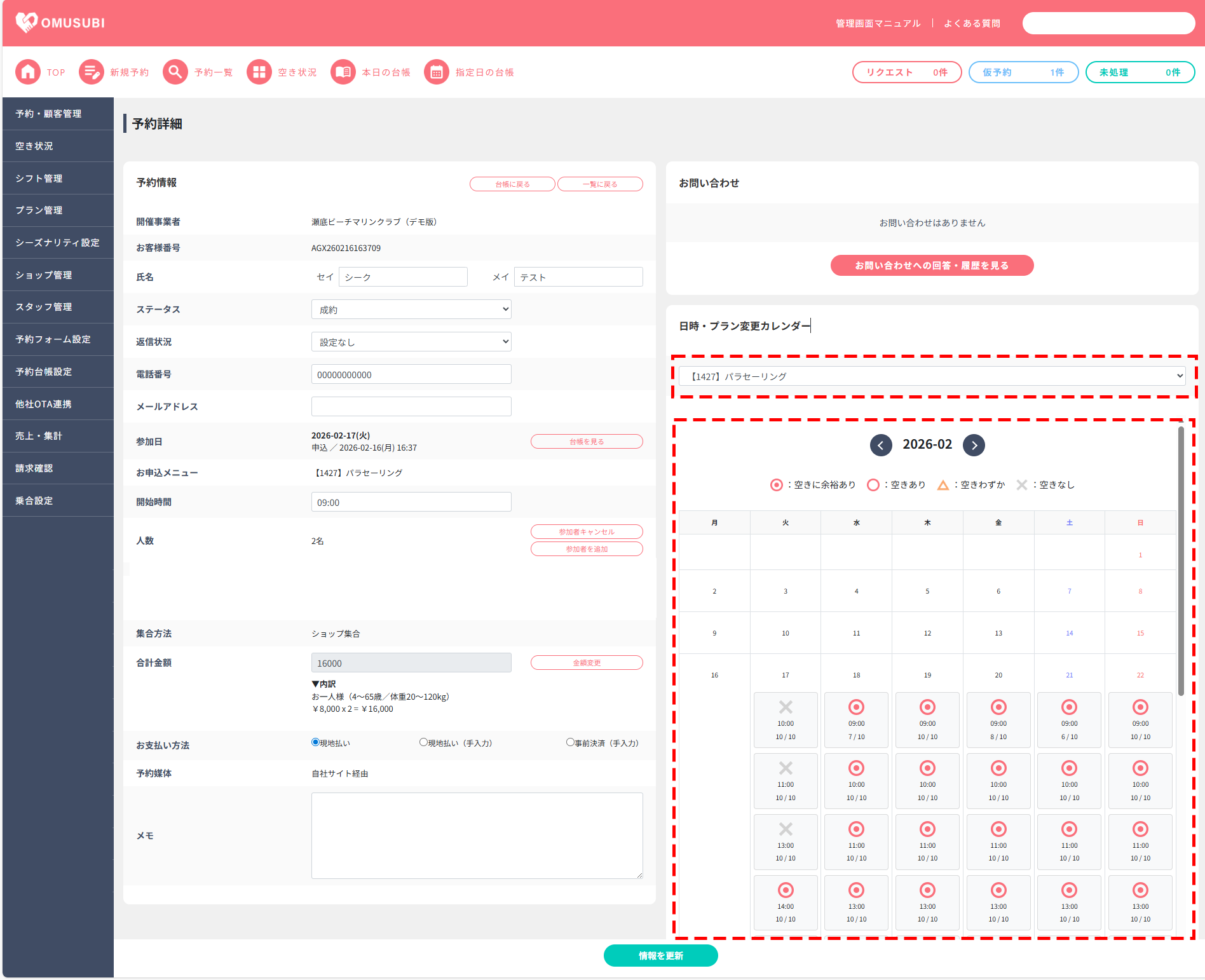 当日の予約日時の変更や、在庫がないプランの日時変更などを行うことが可能です。