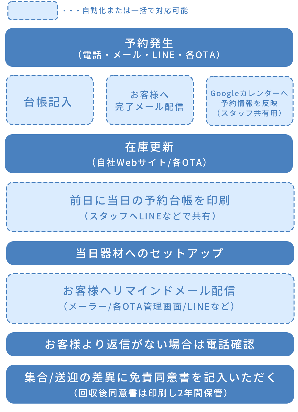 OMUSUBIの機能を使用した場合、図の波線ブロックのタスクが自動化または一括で対応可能となります。