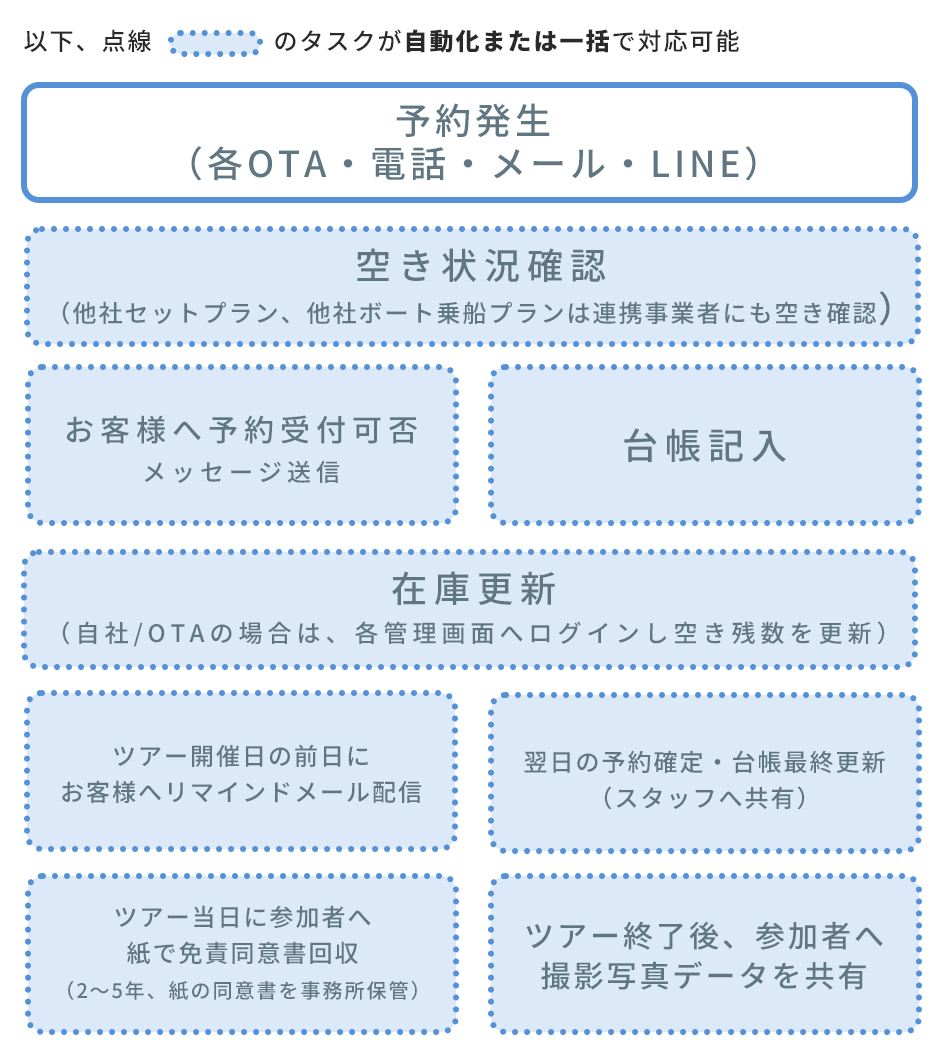 国内主要OTAや海外OTAからの予約メールを自動で取り込み、台帳への転記作業をゼロにします。さらに、急な天候不良や欠員などで予約受付を停止したい際は、OMUSUBI上から「じゃらん・アクティビティジャパン・アソビュー」の在庫を「一括売り止め」できるため、各管理画面へ個別にログインする手間を省き、オーバーブッキング等のトラブルを未然に防ぎます。