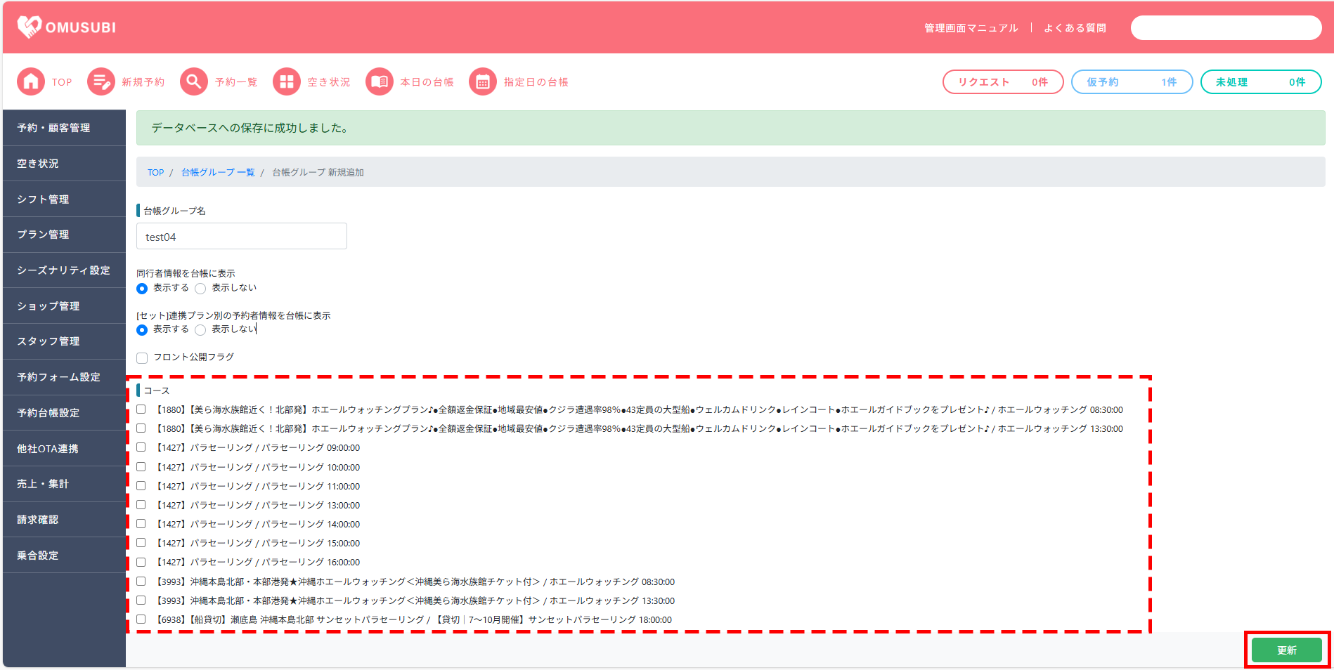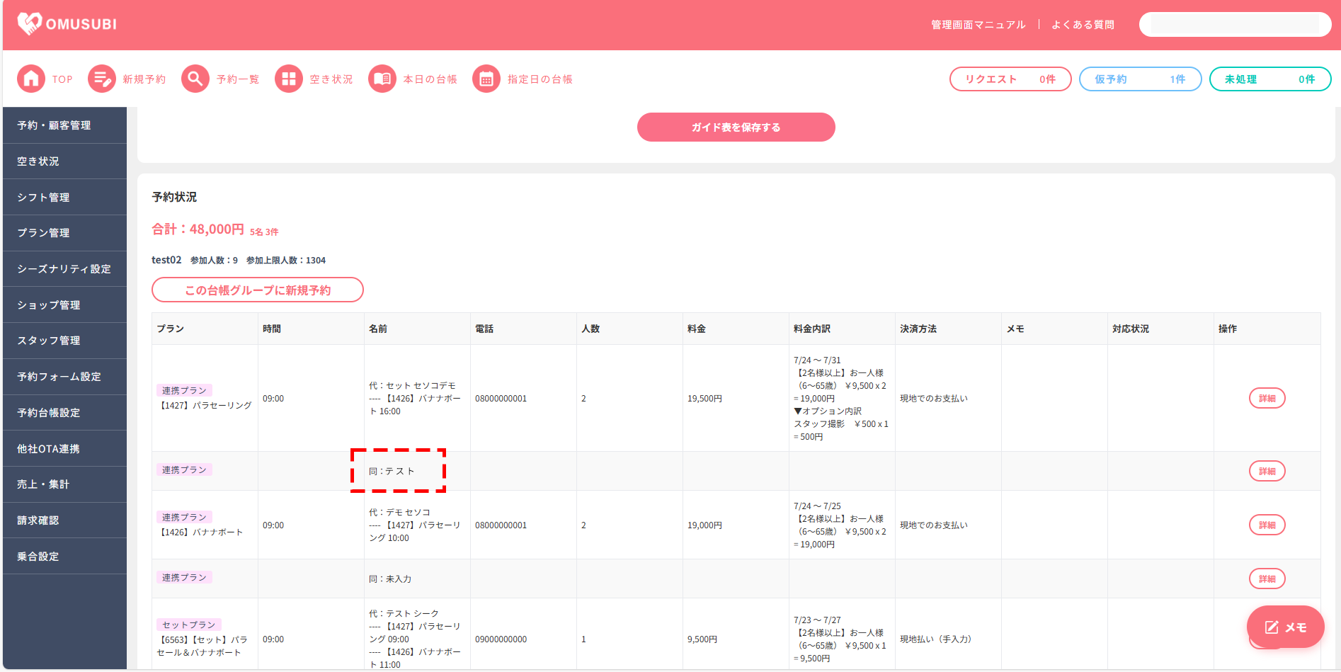 以下手順にて、同行者情報・セット連携プラン別の予約情報を台帳に表示設定いただく事も可能です。
