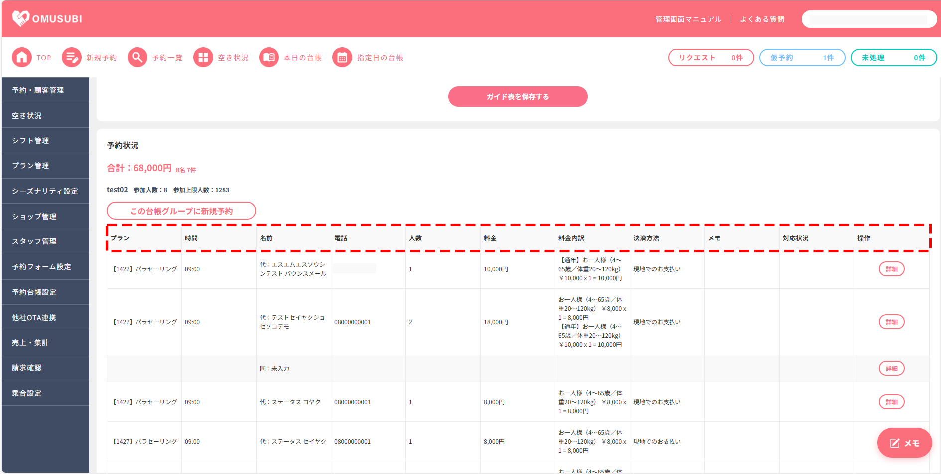 予約台帳(表示項目カスタマイズ可能)|予約台帳表示項目設定