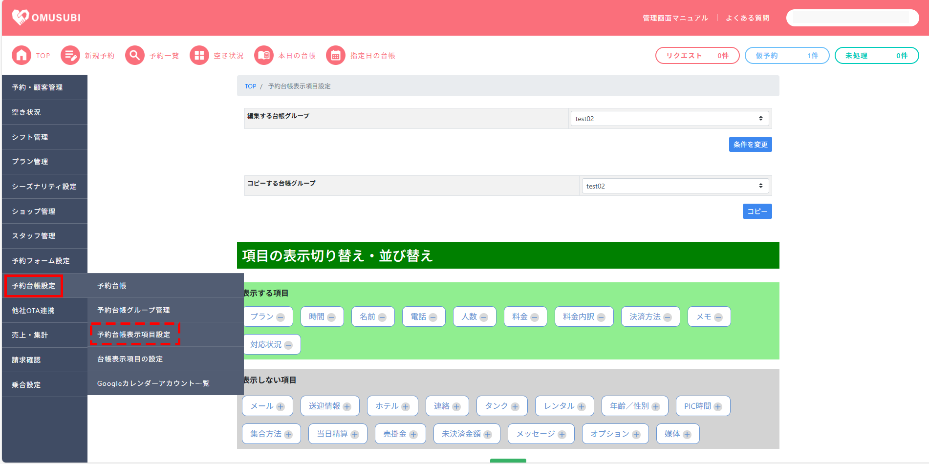 予約台帳表示項目設定