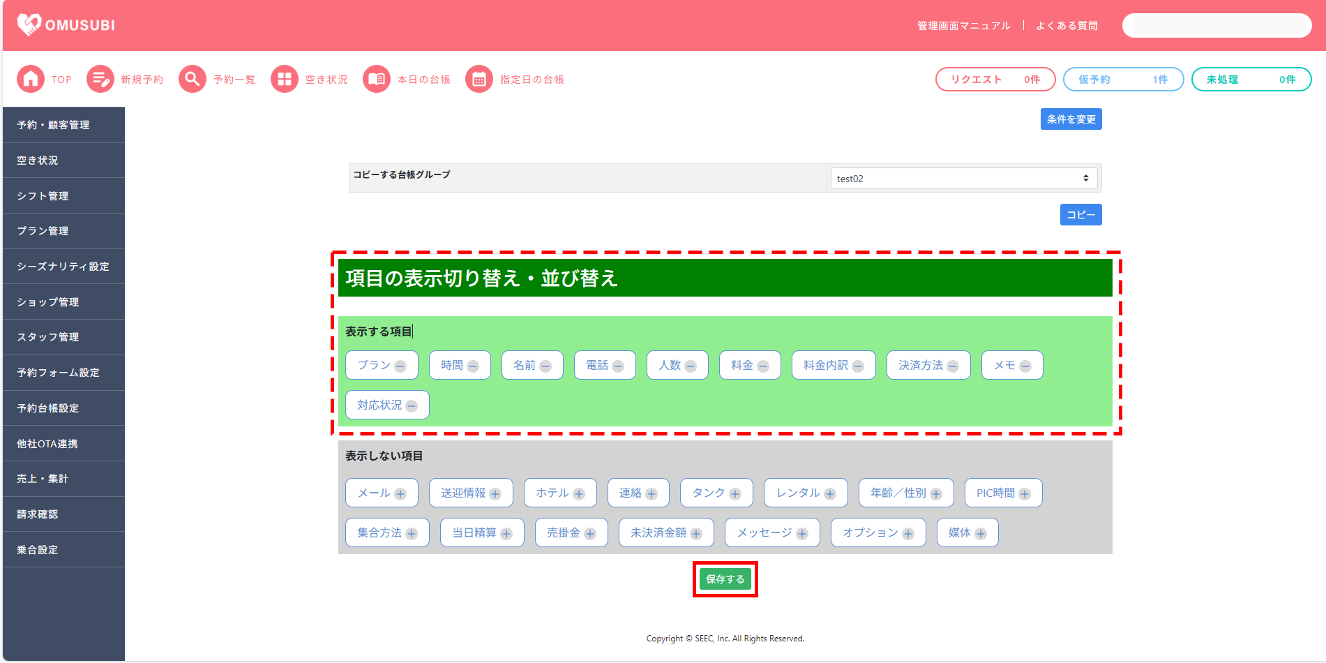 • 項目の表示切り替え・並び替えにて、予約台帳にて表示したい項目を[表示する項目]に選択します。