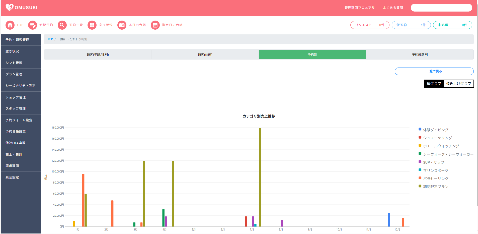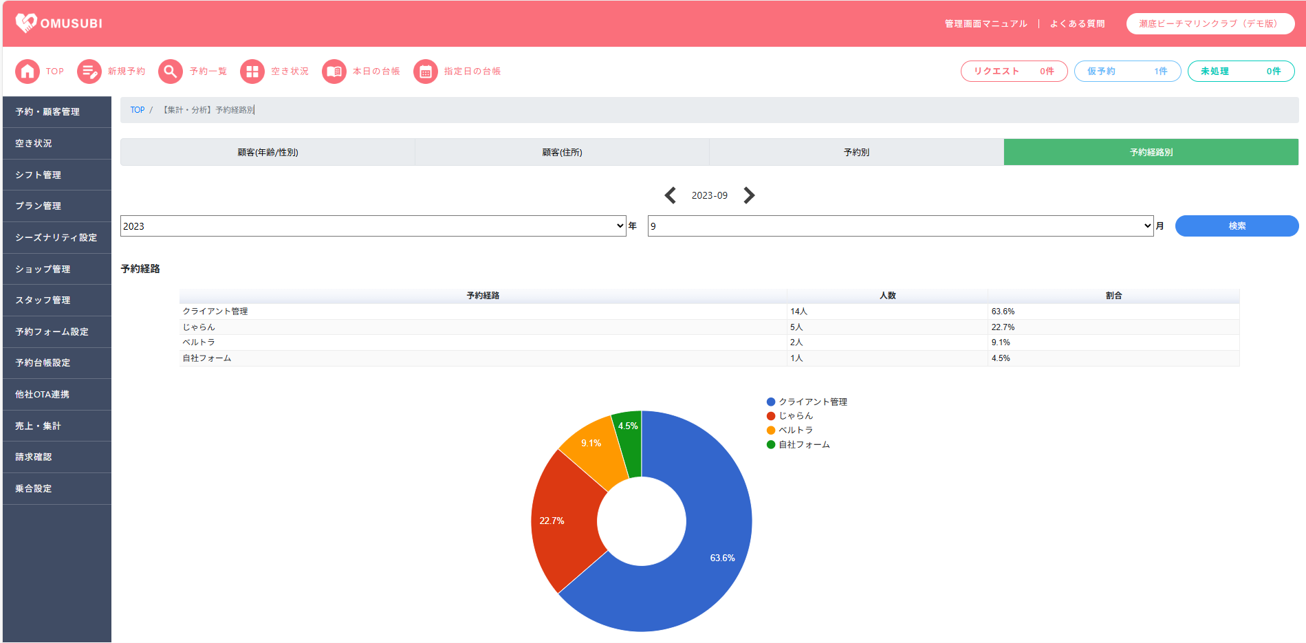 OMUSUBIに蓄積された予約情報を元に各種集計・分析データを閲覧可能です。