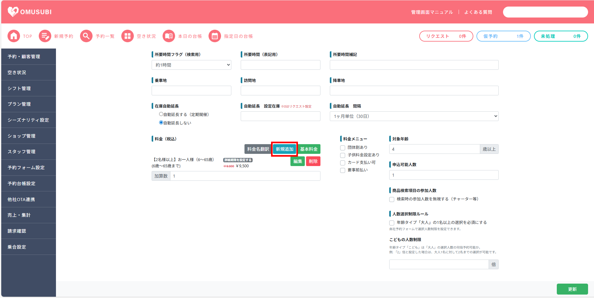 料金の項目の該当の料金の[新規追加]をクリックします。