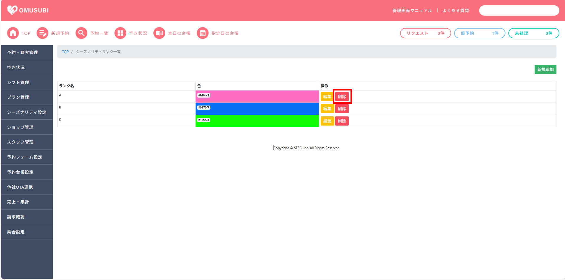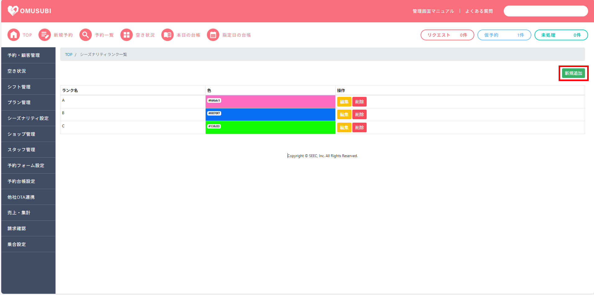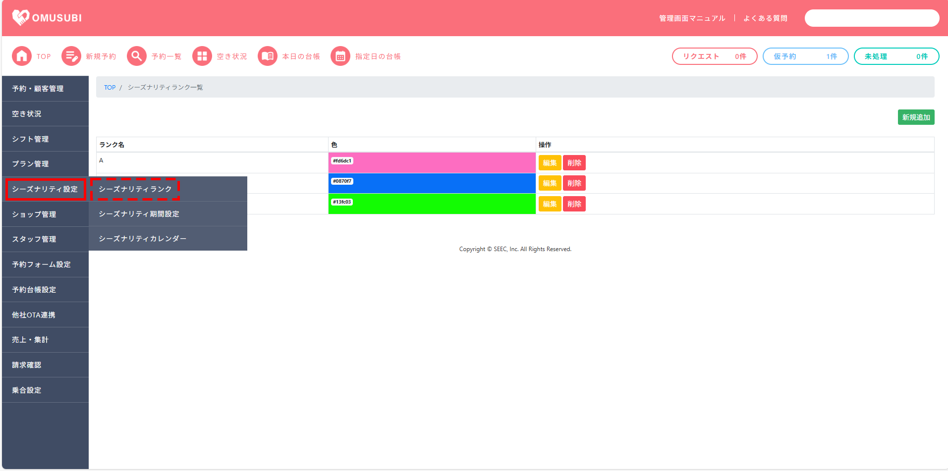 一覧に反映されているシーズナリティランクは[新規追加][編集][削除]が可能です。