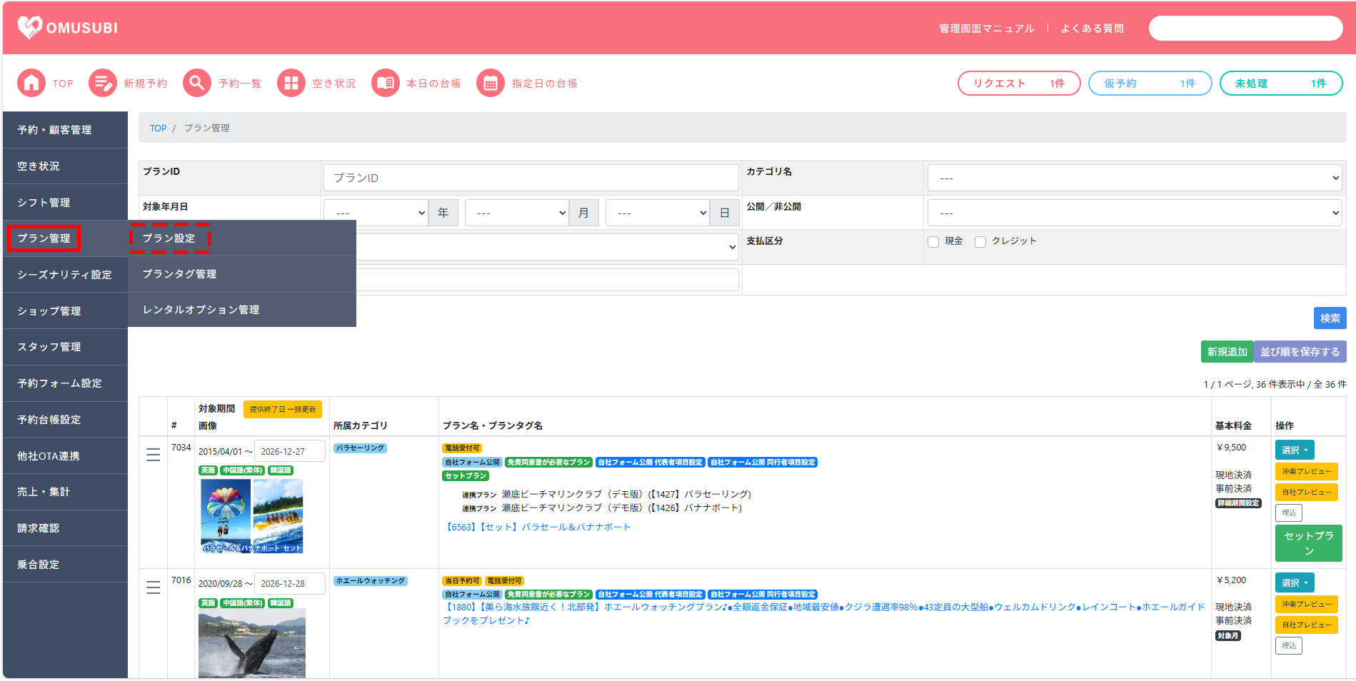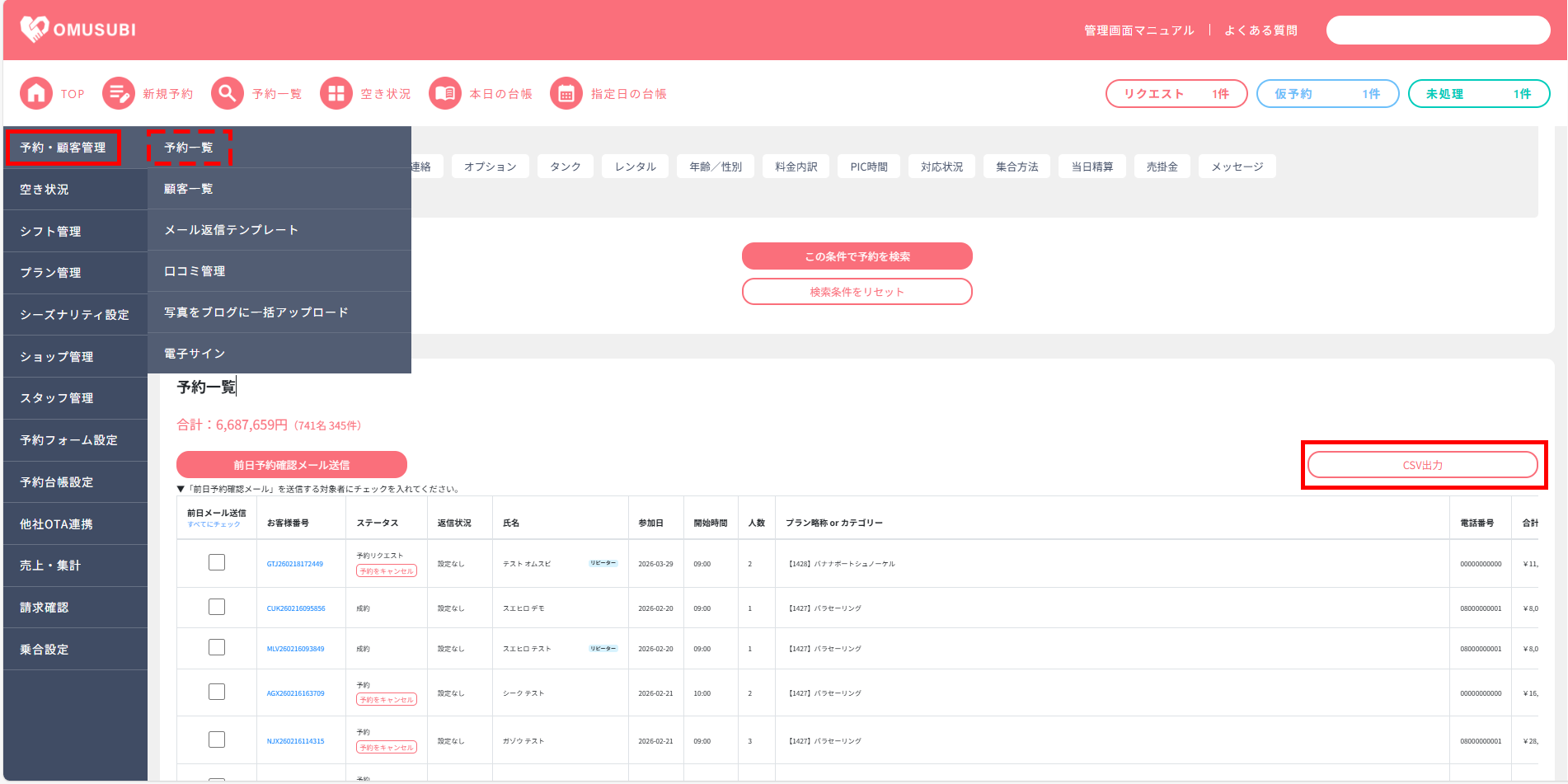 お客様がどの媒体を通じてご予約をされたのか、流入元を確認するためには予約一覧画面でCSVデータを出力します。