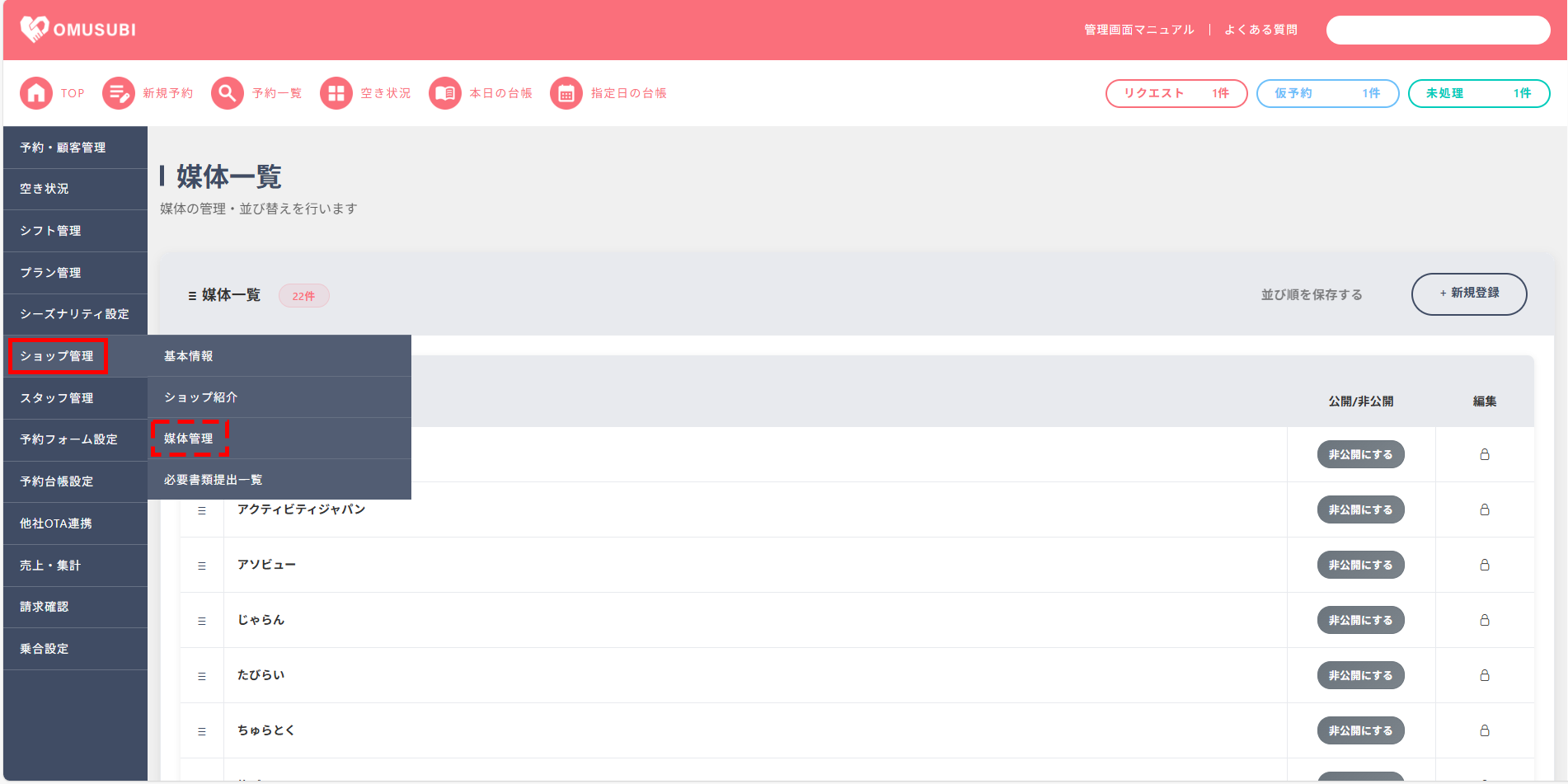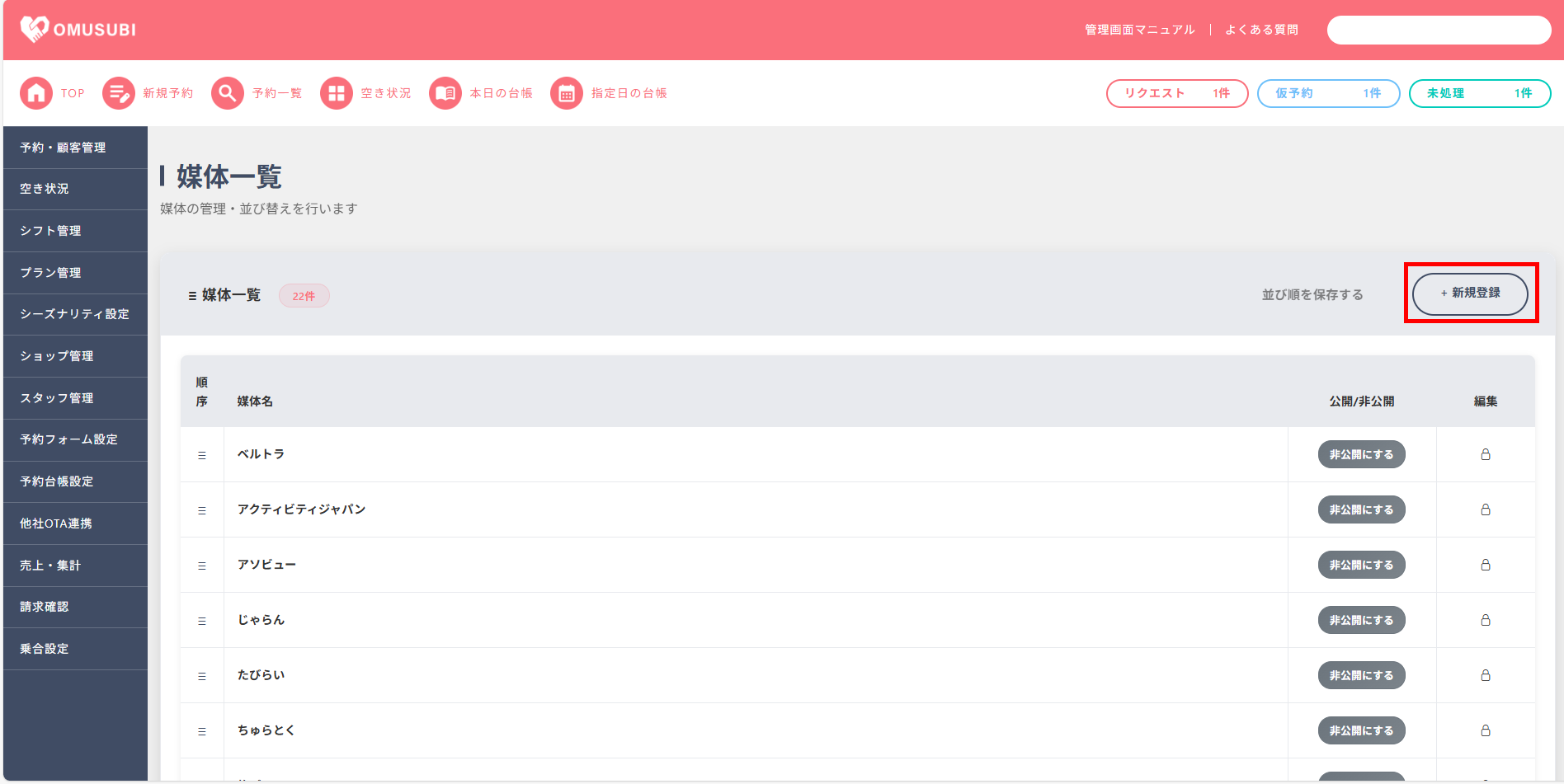 媒体一覧画面に現在登録されている媒体が表示されます。外部共有用URLを生成したい媒体が登録されていない場合は、新規登録を行います。