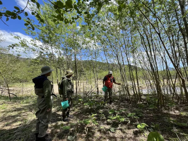 川を歩く ヤンベツ川に沿って散策します。(車で移動する場合もあります) このツアーの特色 ・胴長(ウェーダー)を使用して、川の中を歩きます。 ・森と水辺の繋がりについて、観察をします。