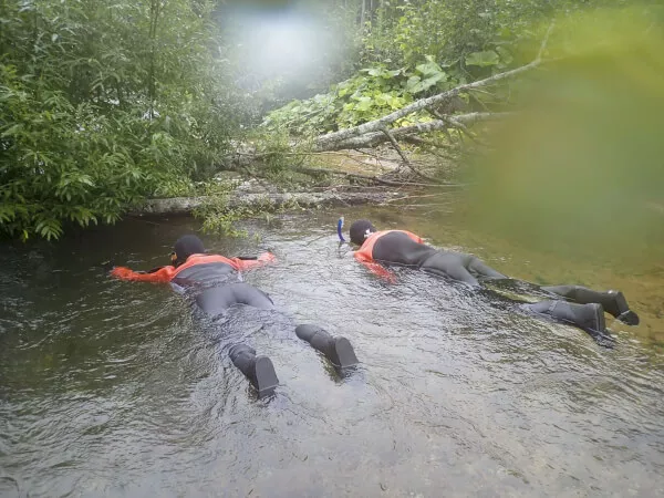 水中メガネとシュノーケルを 装着しますが、 川は浅いため もぐることはありません。