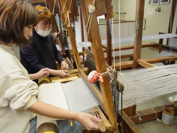実際に塩沢の織物に使われている高機(たかばた)と呼ばれる機織り機と絹糸を使って塩沢織の作品を作ります。