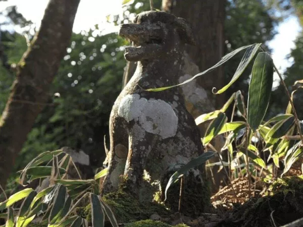 御岳神社の守護神はオオカミ。大口真神と云われています。〔日本武尊が東夷征討のさい、御岳山に宿陣した後、次の地に出発しようとした時、大鹿があらわれ道をふさいだ。尊は山ニラをとって、その目に投げつけると、大鹿はたちまち山鬼の正体をあらわした。と、大山鳴動し、雲霧が湧き上がり、尊の一行は道に迷った。すると、どこからか白狼があらわれて道案内をしたので、無事に進むことができた。尊は狼にむかって「御岳へもどって、火難盗難の守護をしろ」と、命じた。〕という伝承があります。