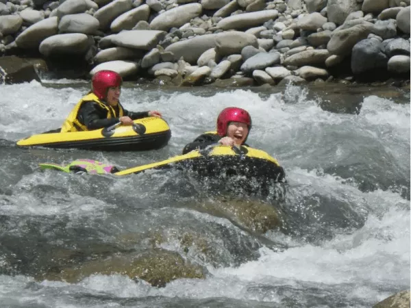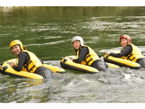 一人乗りのボディボードに乗り込み、諏訪峡コースの激流を下る最新ウォーターアクティビティがハイドロスピードです。