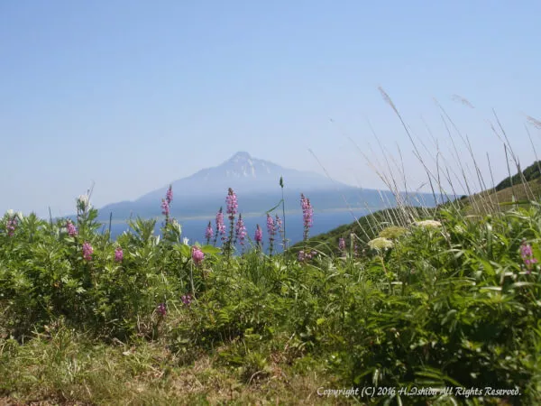 斜面に広がるお花畑と利尻山を眺めながら歩いていき海岸線へ落ちる