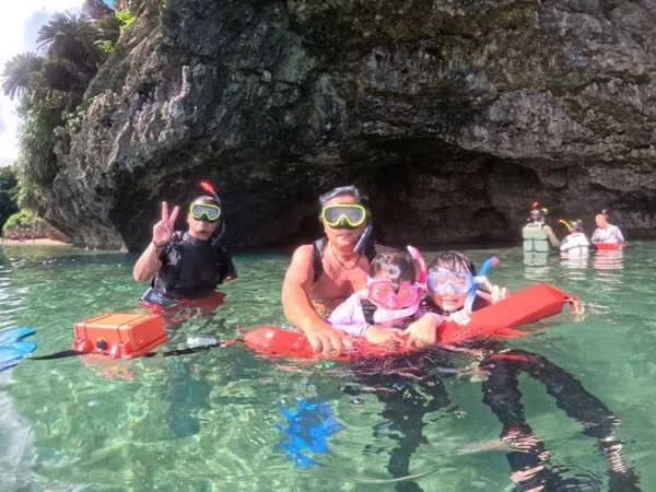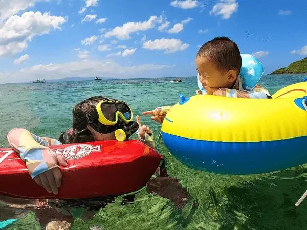 ビーチエントリーで安心。 ビーチから浅瀬をシュノーケリングで進んでいくので、シュノーケリング初心者でも不安なくお楽しみいただけます。 また幼児には乗る事が出来るフロート状の浮きと箱めがねをご用意しております。 5歳以上のお子様はシュノーケリングの仕方を丁寧に教えるので、一緒に海の世界を満喫できることでしょう。