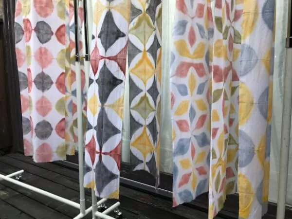 阪急池田駅前にある栄町商店街にある工房でベンガラ染めの板締め絞りを体験して頂けます。