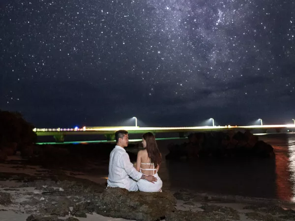 観光スポットでもあるうるま市の与勝半島から四つの離島へと延びている海中道路+浜比嘉かAJリゾートアイランド伊計島で星空達をバックに最高のロケーションで撮影☆彡サプライズ(告白、プロポーズ、誕生日)にも那覇から沖縄高速道 沖縄北ICより40分の観光スポットでもあるこの場所でインスタ映え間違いなしですよ!!