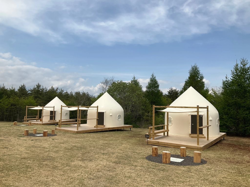 眼前に浅間山がそびえ立っており、浅間山から近い施設です。とんがり屋根でマシュマロのような外観の「ジオルームグランピング」も併設。手ぶらでもキャンプができます。ワンちゃんも一緒にお越しいただくことも可能です。