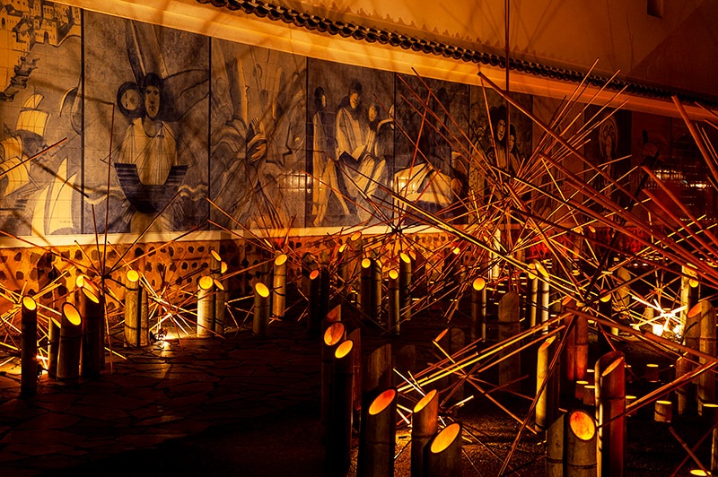 二王座などの歴史ある町並みに、約2万本もの竹ぼんぼりが灯され、優しい光で街全体が幻想的に包まれます。地元団体やボランティアが制作した竹のオブジェも約30ヶ所に設置され、お祭りを彩ります。