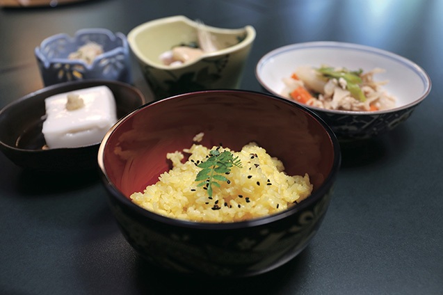 次に江戸時代の倹約令から生まれた、質素ながらも工夫が凝らされた郷土料理が今も受け継がれています。「黄飯」 (おうはん) ※や黄飯かやくは、クチナシの実で炊いた鮮やかな黄色の炊き込みご飯「黄飯」と、白身魚や野菜を煮込んだけんちん汁のような「かやく」を一緒にいただきます。