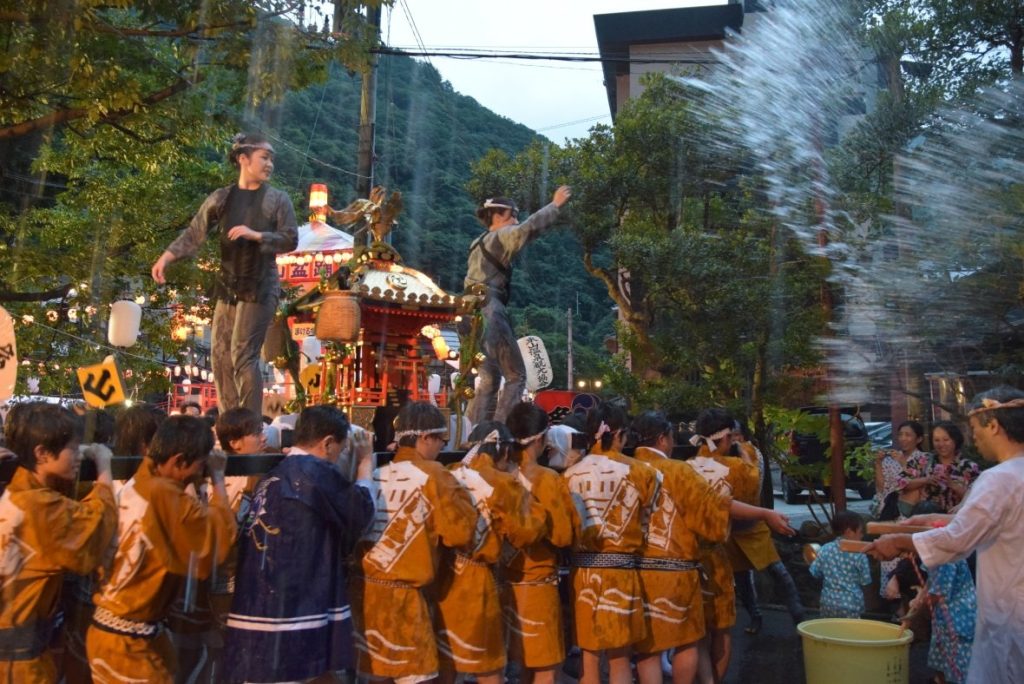 お湯かけまつりは8月9日に実施しました。こちらのお祭りは、地元温泉街の若衆・芸妓衆や地元の子供たちが、神輿を担ぎ温泉街を練り歩きながら、各宿に宿泊しているお客様から温泉の湯を浴びせかけてもらうお祭で、縁起物の湯銭もまかれます。
