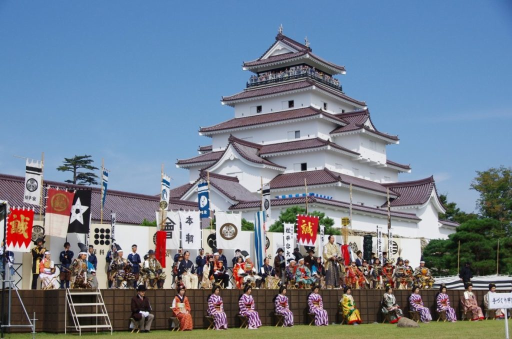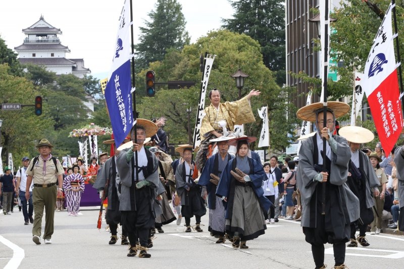 会津まつりの見どころは、会津藩公行列。総勢約500~600人が、江戸時代の武士に扮し、市内を練り歩く最大のイベントです。馬に乗って参加する人もおり、臨場感あふれる光景が楽しめます。