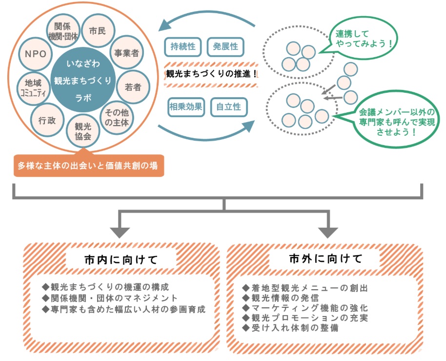 稲沢市観光協会をファシリテーターとし、市民、関係機関・団体や行政など、多様な主体がいなざわ観光まちづくりラボを媒介として有機的につながり、それぞれの役割やノウハウを活用し合うことで、稲沢市ならではの着地型観光メニューの創出や新たな観光・交流事業の推進、魅力の再発 掘・再構築を実施していきます。