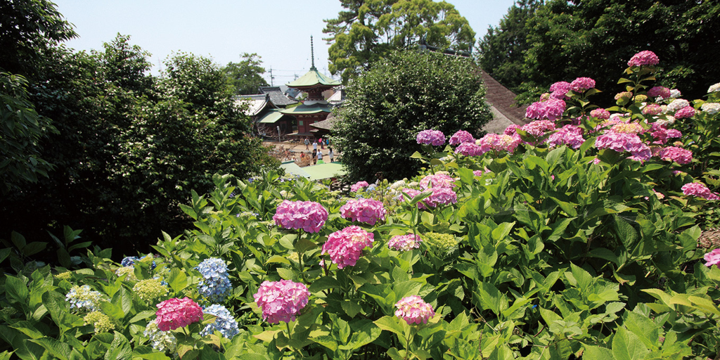 6月に入ると、性海寺の境内地内に整備した「大塚性海寺歴史公園」のあじさいが咲き誇り、「稲沢あじさいまつり」が開催されます。公園には、「紅」「花火」「城ヶ崎」「甘茶」などの日本のアジサイと「アナベル」 「八重咲カシワバアジサイ」などの西洋のアジサイが植栽されています。シーズンには約90種を数えるアジサイが園内を彩ります。